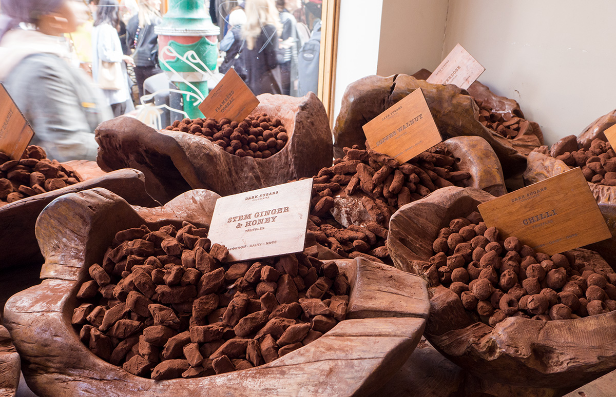 Lontoossa on useita kiinnostavia tori- ja markkina-alueita. Ennätimme käydä niistä kolmessa, Borough Marketissa, Spitalfieldsissä ja Brick Lane Marketissa. Erityisesti Brick Lane ja Hoxtonin alue tekivät vaikutuksen! Brick Lane on pitkä katu täynnä mielenkiintoisia designputiikkeja, katuruokakojuja ja kahviloita. Mukaan tarttui muun muassa yllättävän hyvä Mac´n Cheese annos ja Dark Sugars Choclolatesin taivaallisia käsin tehtyjä suklaakonvehteja. Yrityksen perustaja ghanalainen Nyanga on tuonut suklaaosaamisensa suoraan perheensä kaakaoplantaaseilta Itä-Lontooseen.
